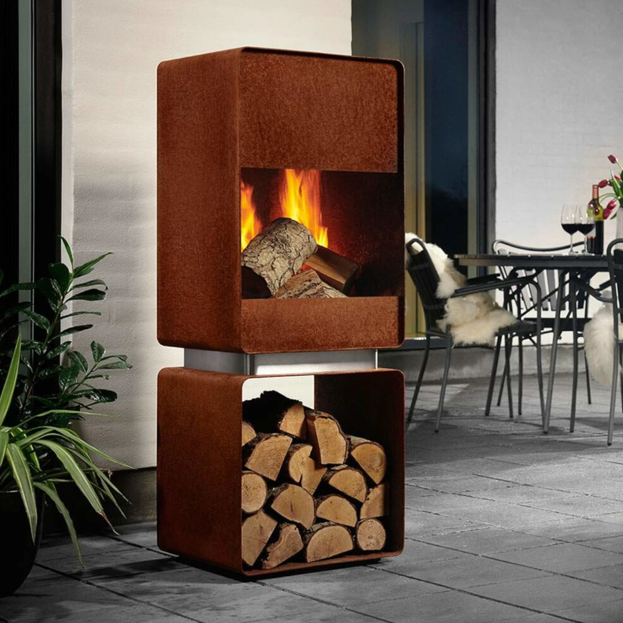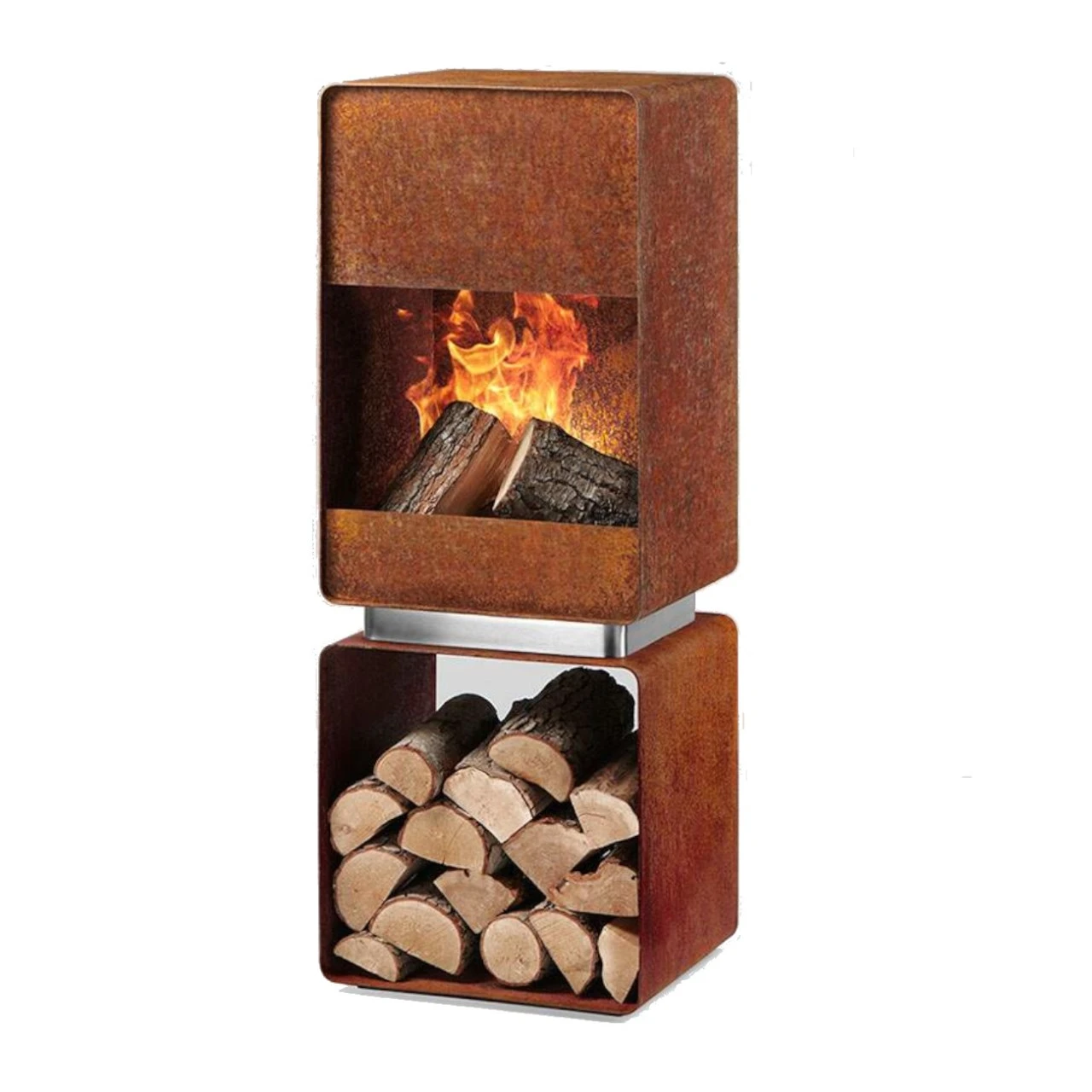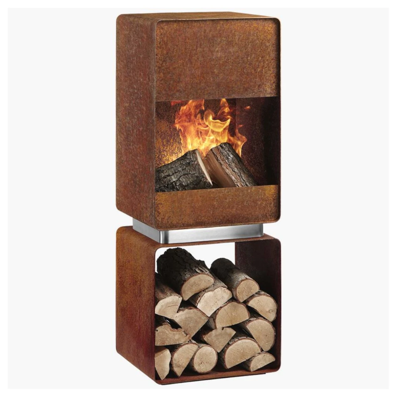 Der Alpha Gartenkamin ist aus einer Kombination von Corten- und gebürstetem Edelstahl gefertigt. Sobald sich die Patina gebildet hat, wird der Edelstahl-Abstandhalter einen erstaunlichen Kontrast zwischen der rohen Patina des Cortenstahls und der gebürsteten Oberfläche des Edelstahls schaffen – ein idealer Gartenkamin für ein modernes Zuhause.