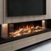 Dieser Kamineinsatz hat verstellbare Flammen und glühende Holzscheite und Kohlen. Links und rechts befindet sich eine Glasplatte, die den Eindruck eines Gaskamins erweckt. Die Frontseite ist offen.