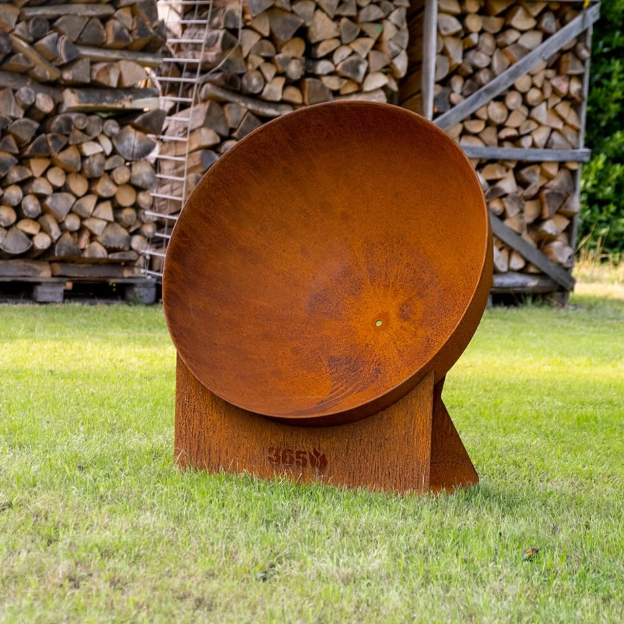FeuerCampus365 Gartenkamin Feuerschale TALYN Satellit Cortenstahl – Windgeschützte Feuerschale auf kleinem Sockel