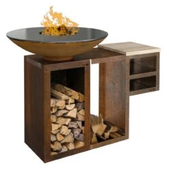 Das PIO 100 Premiummodell besteht aus einem gradlinigen geschlossenen oder offenen Sockel mit Holzlager, einer elegant geformte Feuerschale mit Plancha (Grillplatte) sowie einem seitlichen Anhang welcher Platz zum Ablegen von Grillzange und Grillgut auf unserem hochwertigen Schneidebrett bietet. Außerdem hat das Premium-Modell auch schon den wunderbaren TopGrill inklusive.