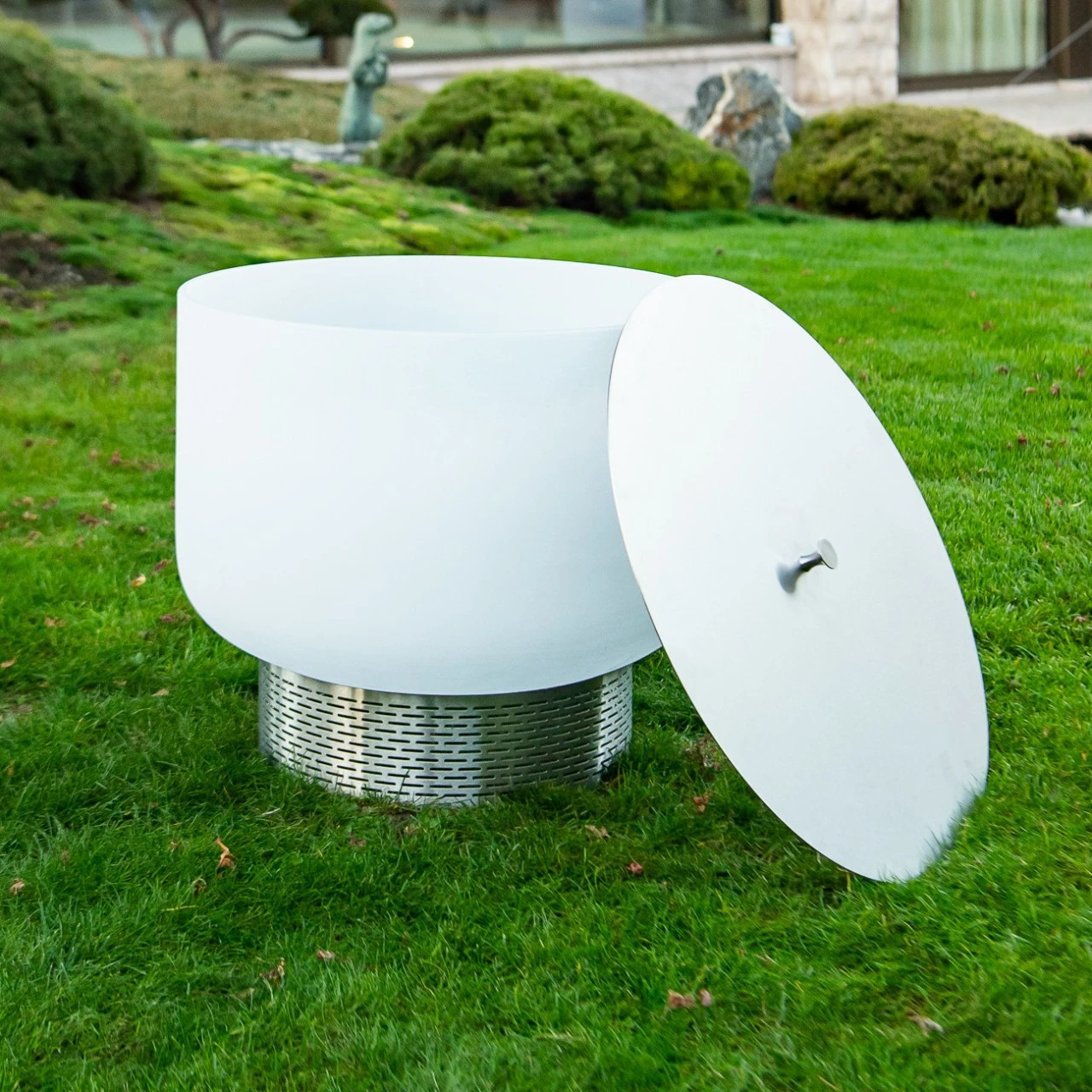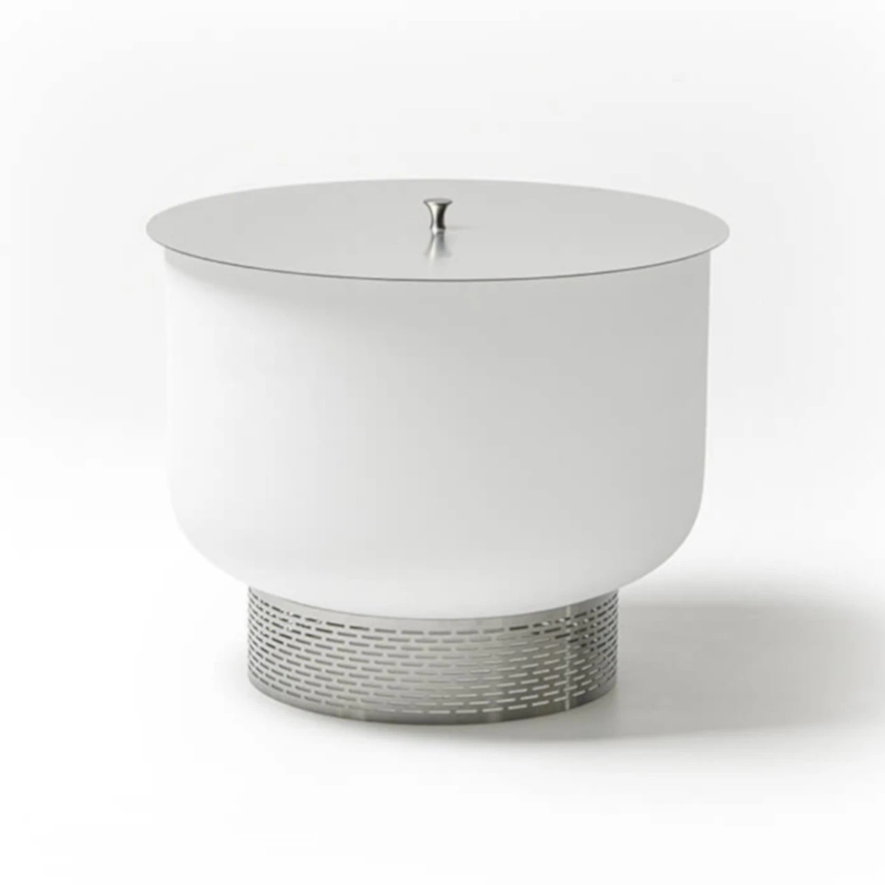 Zum Auslöschen der Flamme und zum Schutz der Glasfeuerschale dient der passgenaue Edelstahl-Deckel „QLid” mit einem Durchmesser von 54 bis 75 cm aus rostfreiem, seidenmatt geschliffenem Edelstahl.