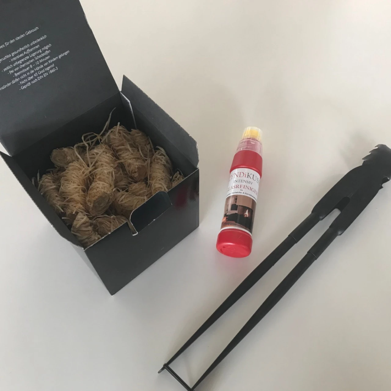 1 Box Holzwolle-Anzünder; 1 Scheibenreiniger; 1 Kaminholz-Zange zum Nachlegen des Holzes