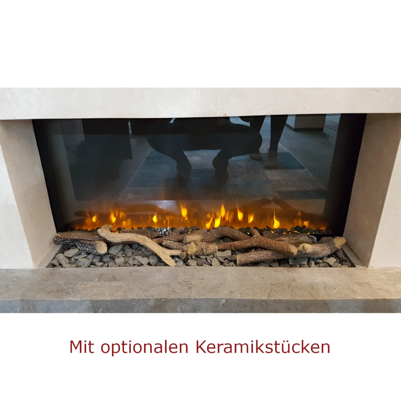 Der Kamin Santos wird inklusive grauem Basaltsplit geliefert. Optional auch mit Deko Holz Stücken.